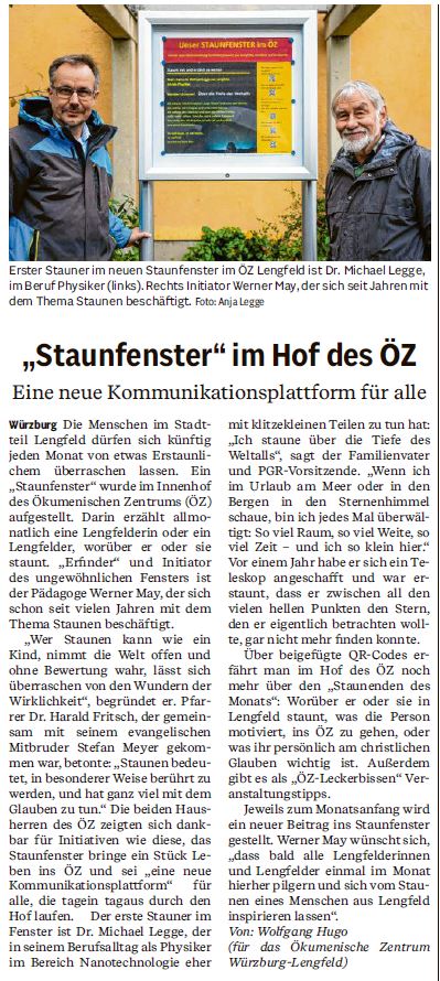 Wo finde ich das Staunfenster? Im Ökumenischen Zentrum Lengfeld, Am Schlossgarten 2-4, kurz vor der Brücke über die Kürnach rechts findest du das Staunfenster. Dort kannst du vieles lesen, direkt oder online (also immer gleich einen QR-Scanner mitnehmen).